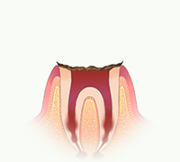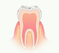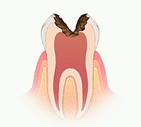 C2の時よりも痛みの自覚症状が強くなります。C3以降の治療は、むし歯が神経に到達しているため、神経を除去する治療が必要になります。そして、神経除去後は歯が非常にもろくなりますので、クラウンなどの「かぶせもの」を装着することになります。治療回数は5~6回かかります。